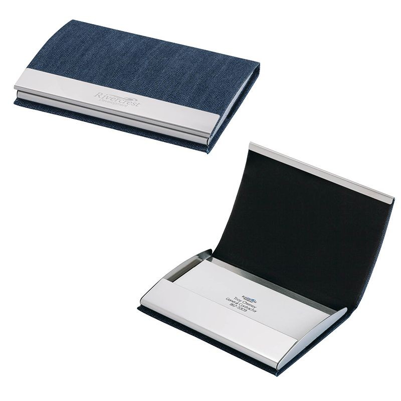 We’re going to discuss two ways to carry your business cards in this blog. The first is this card case. There’s plenty of space up front for branding (this model is a nice hybrid of denim and stainless steel), and what we really like about this branding opportunity is that every time your customer retrieves a card they will be representing not only themselves but your company as well.